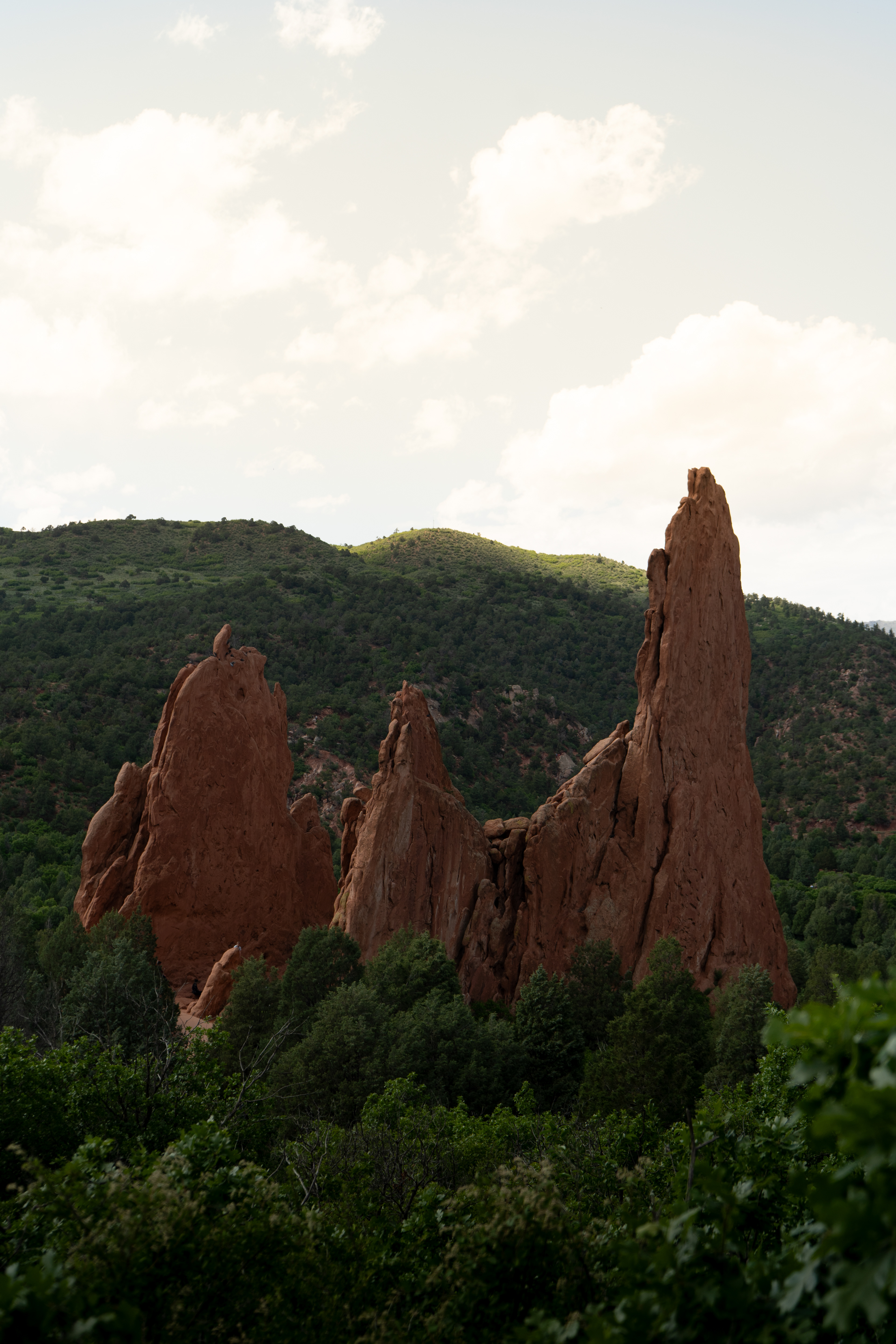 In Colorado's Garden of the Gods, towering red sandstone formations rise sharply against a backdrop of verdant pine forests and distant mountain peaks -- a vivid testament to the earth's layered history and diverse beauty.